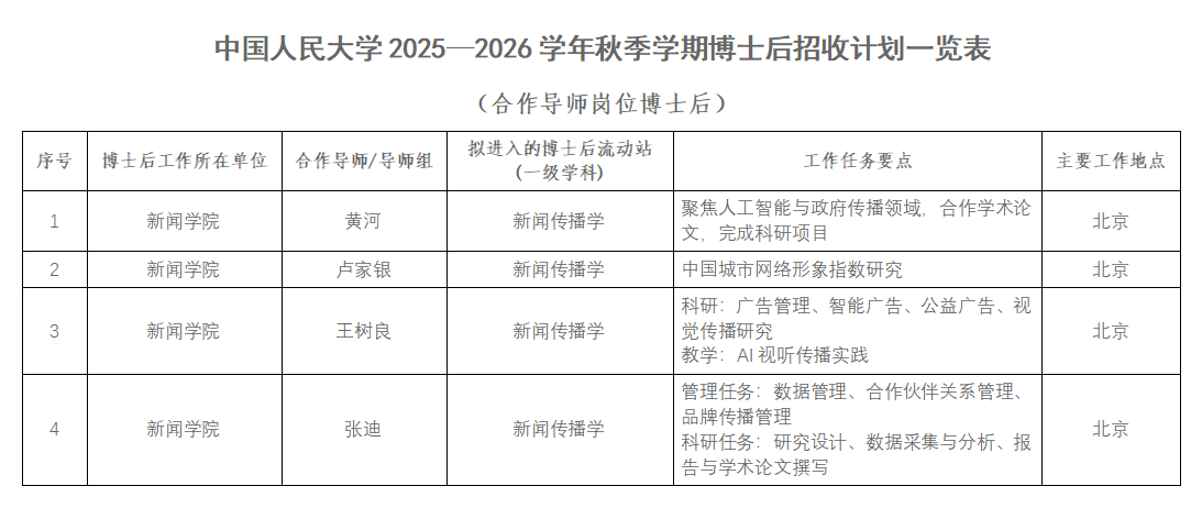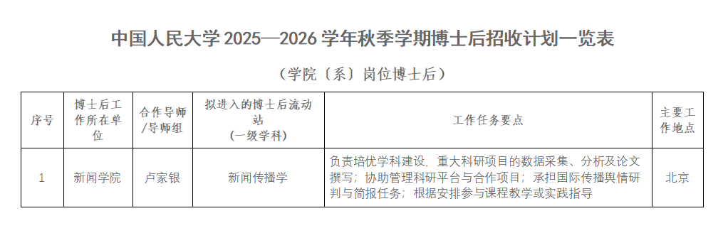 为促进中国人民大学新闻传播学科“双一流”建设,培养师资后备人才,推动学术创新,特面向海内外招聘杰出青年博士到我院从事博士后科研工作。