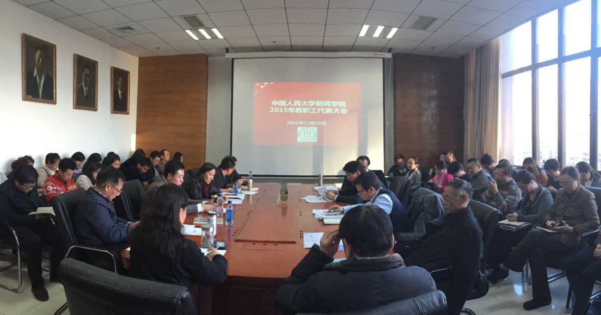 12月30日下午,中国人民大学新闻学院2015年教职工代表大会在明德新闻楼召开,新闻学院执行院长郭庆光,党委书记蔡雯,学校工会副主席胡树刚,新闻学院副院长胡百精、周勇、杨保军,新闻学院党委副书记蒙彬、张辉锋,学院全体教师、行政人员出席,本次会议由蔡雯书记主持。